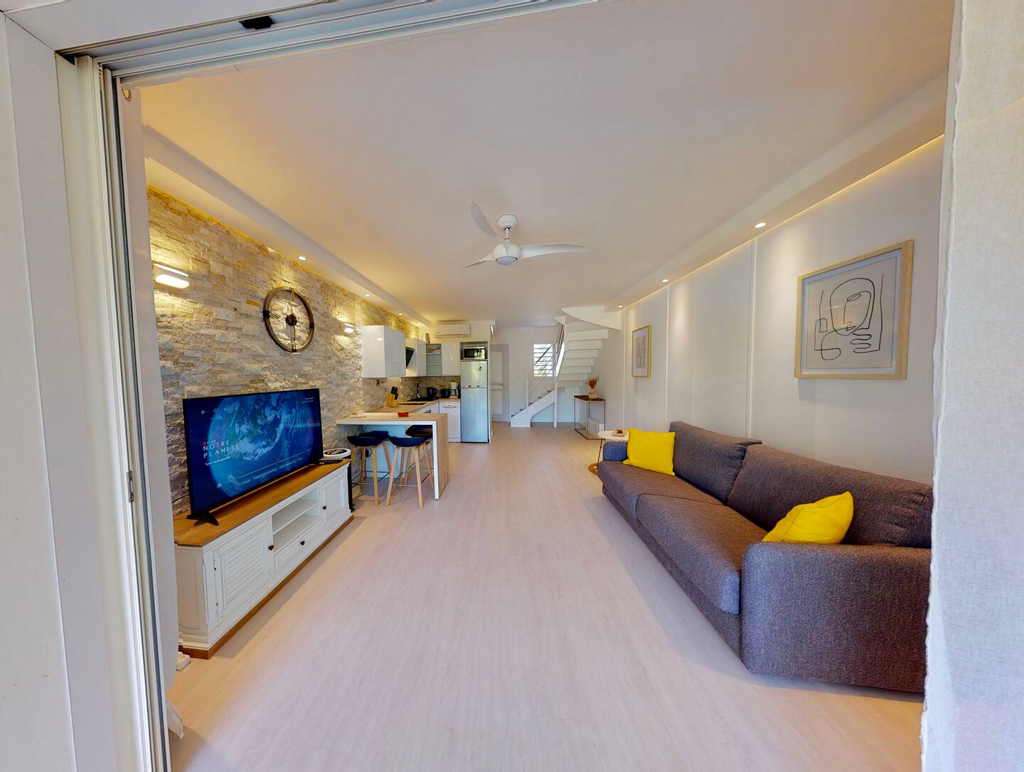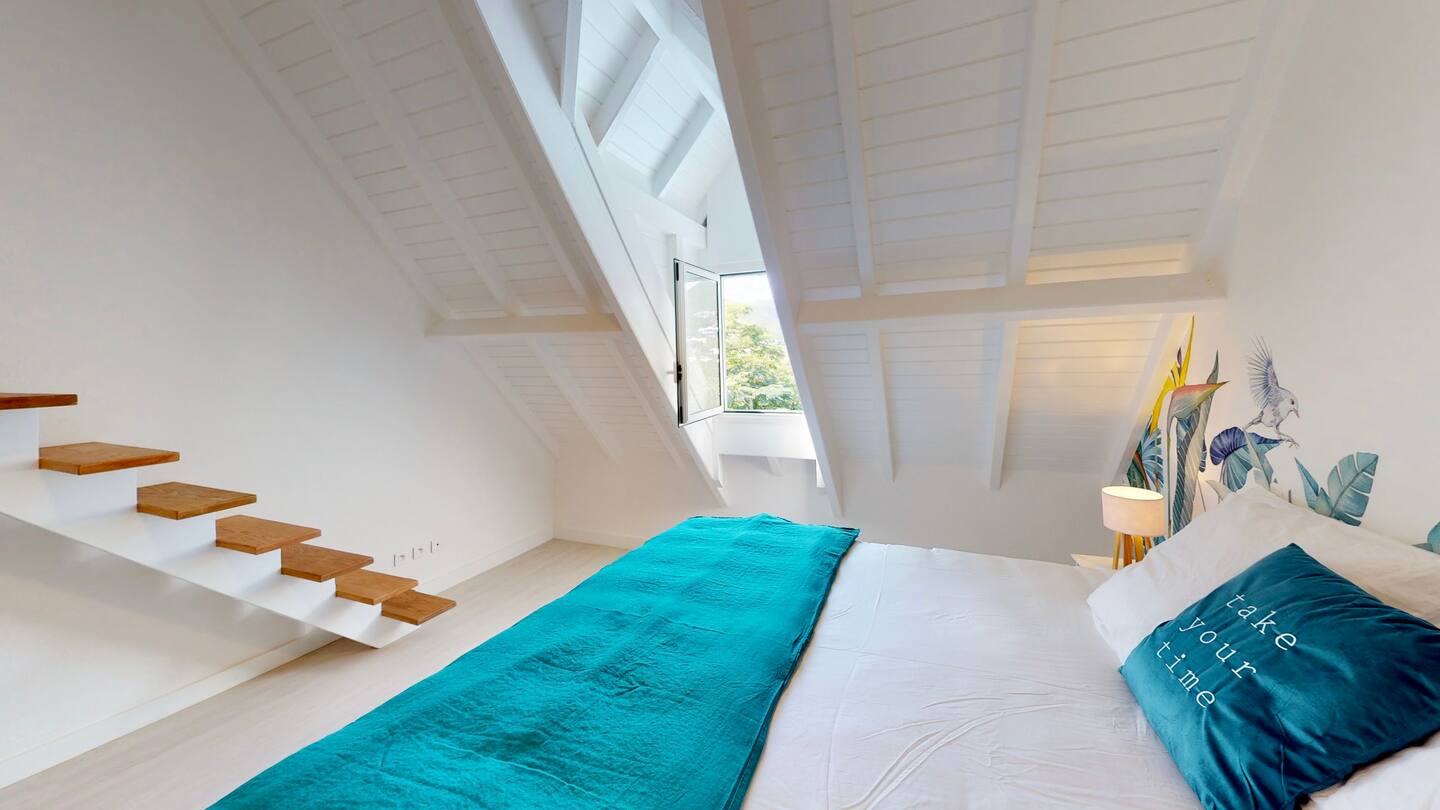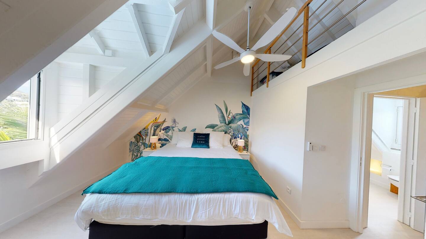 This spacious duplex offers a bright and comfortable setting just steps from the heart of Orient Bay. The main level features a cozy seating area and a fully equipped kitchen — complete with microwave, toaster, coffee machine, and everything you need for easy meals at home.