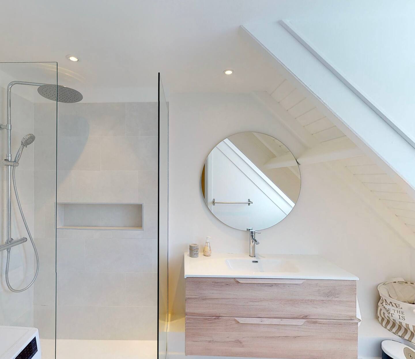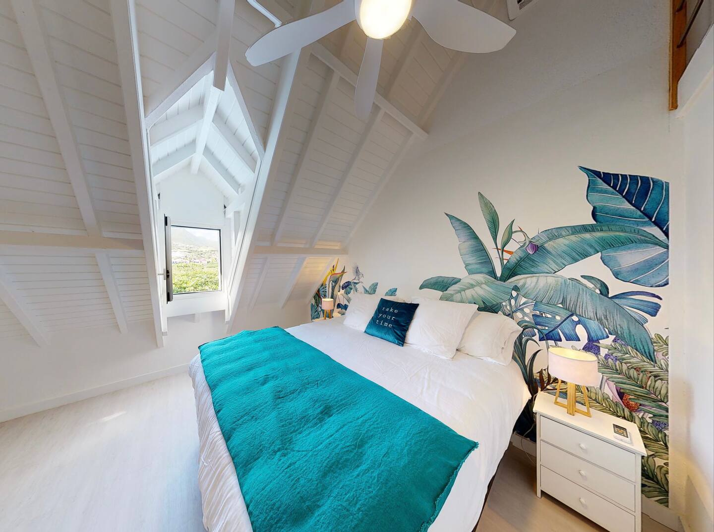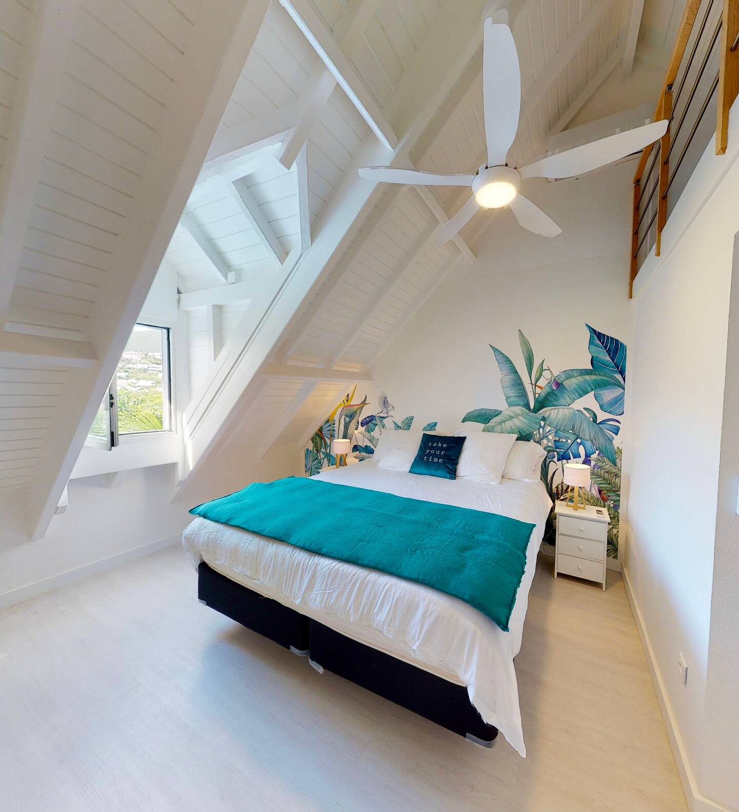 This spacious duplex offers a bright and comfortable setting just steps from the heart of Orient Bay. The main level features a cozy seating area and a fully equipped kitchen — complete with microwave, toaster, coffee machine, and everything you need for easy meals at home.